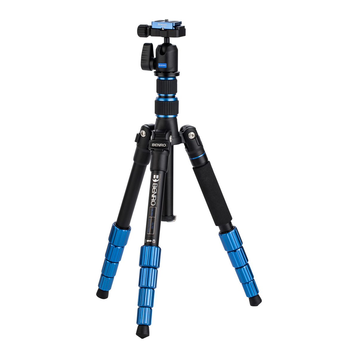 The Benro Slim series has been expanded and now includes two new models that are the perfect travel tripod. Each has 5 sections and the reverse folding design reduces the folded size to only 12.9" (33cm). but don’t let its small size fool you, these tripods open to an impressive 57.1" (145cm) making them a practical solution for photographers who need to travel light but still need to travel with a tripod. There are two models of the Slim travel offering either aluminum or Carbon Fiber construction. Aluminum gives strength but Carbon Fiber remains the ultimate material for lightness and stability. The Slim travel tripod legs are fitted with anodized aluminum twist locks that only require a quick half turn to lock and unlock. A grooved center column prevents twisting when in use and can be reversed for low to the ground shots. Benro Slim travel features a lightweight shoulder, which has 3 leg positions and each leg can be positioned individually for uneven terrain. A weight hook is located underneath the center column for windy conditions and the rubber feet on the tripod are fixed. Staying level is made easy with a bubble level on the quick release clamp. Both versions of the Slim travel series use the compact N00 head. This removable aluminum ball head has an oversized ratchet style single locking control knob for easy operation and a panoramic scale. The ball head includes a blue anodized aluminum Arca-Swiss style quick release plate with a d-ring 1/4"-20 thread. A compact carry case is included.